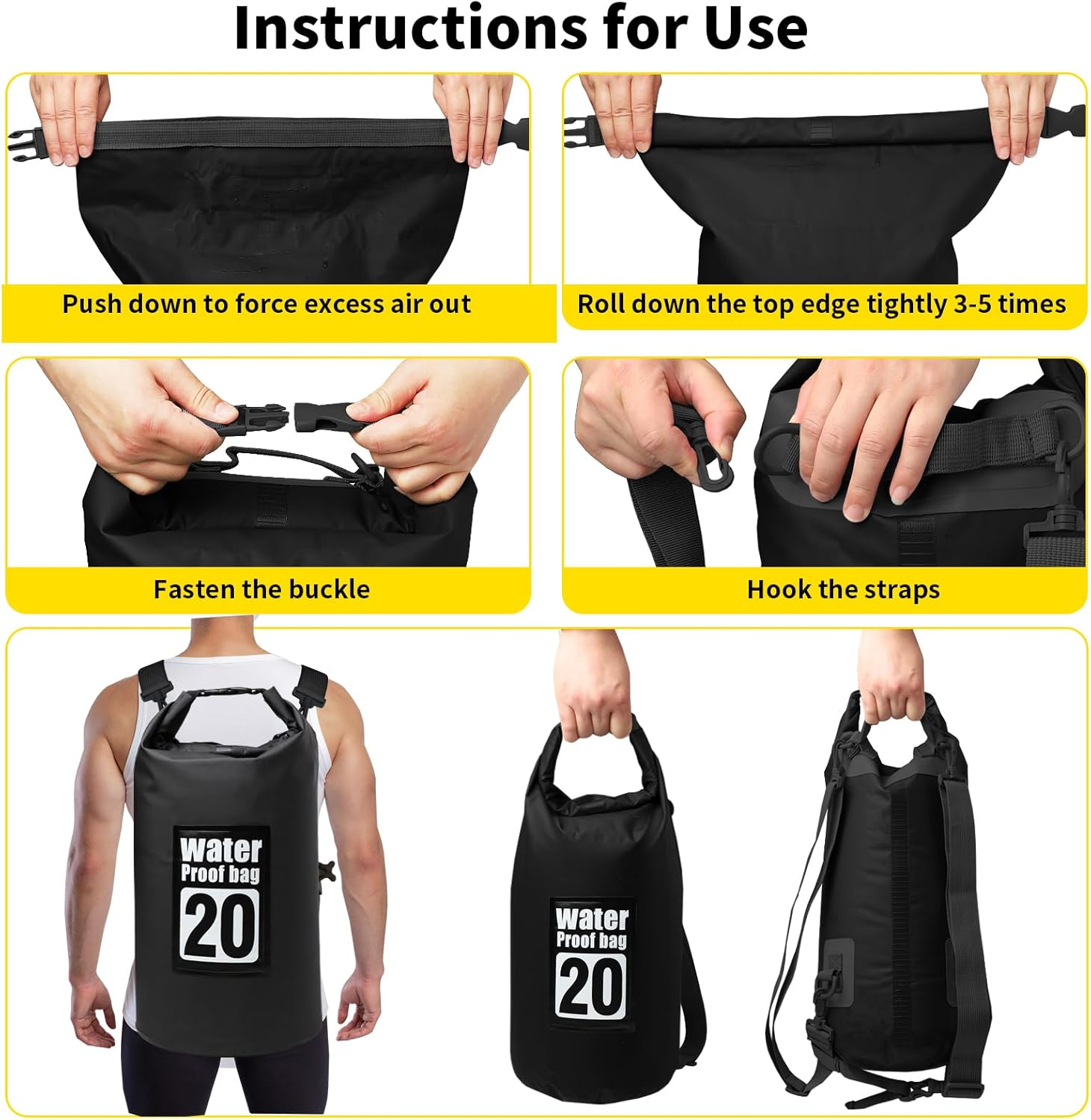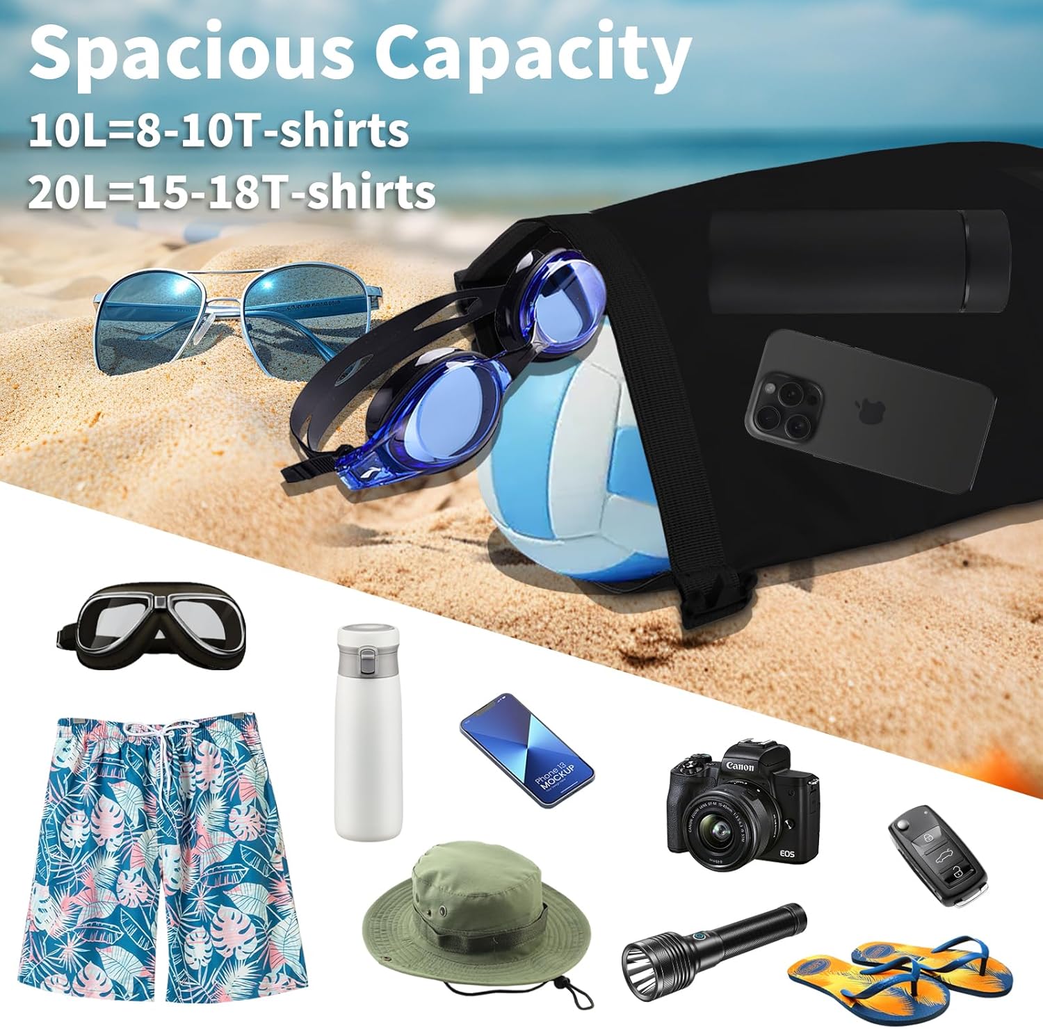 Bolso seco de alta resistencia con **cierre enrollable**, costuras selladas y **correa ajustable**. Capacidad ideal para toalla ligera, ropa, snack, celular y llaves.