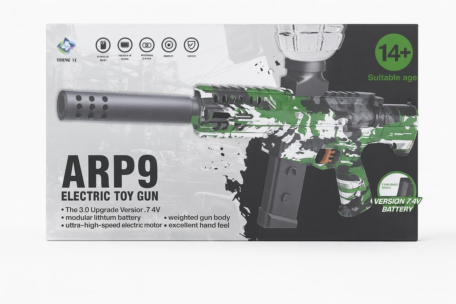 La ARP9 eléctrica 7.4V llega con diseño camuflado verde, cuerpo compacto y sensación táctica moderna. Un juguete para jóvenes de 14+ que buscan potencia, estabilidad y un estilo militar–gamer diferente a los modelos clásicos.